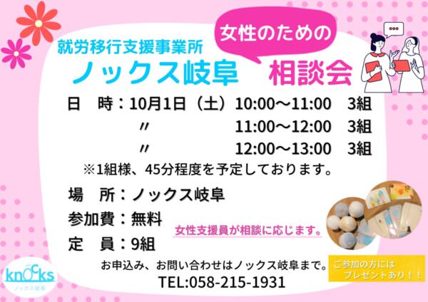 ノックス岐阜では、2022年10月1日に、「仕事」「将来」などにお悩みを抱える女性への無料相談会を開催します。